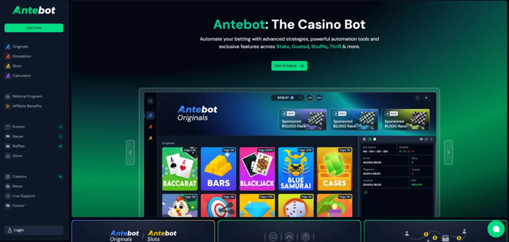 - ゲーム自動化 – Antebot OriginalsではLimbo、Dice、Plinko、Minesなどオリジナルゲームを、Antebot Slotsではスロットを自動でプレイできます。これらはあらかじめ設定した戦略やベットパラメータに従って動作します。