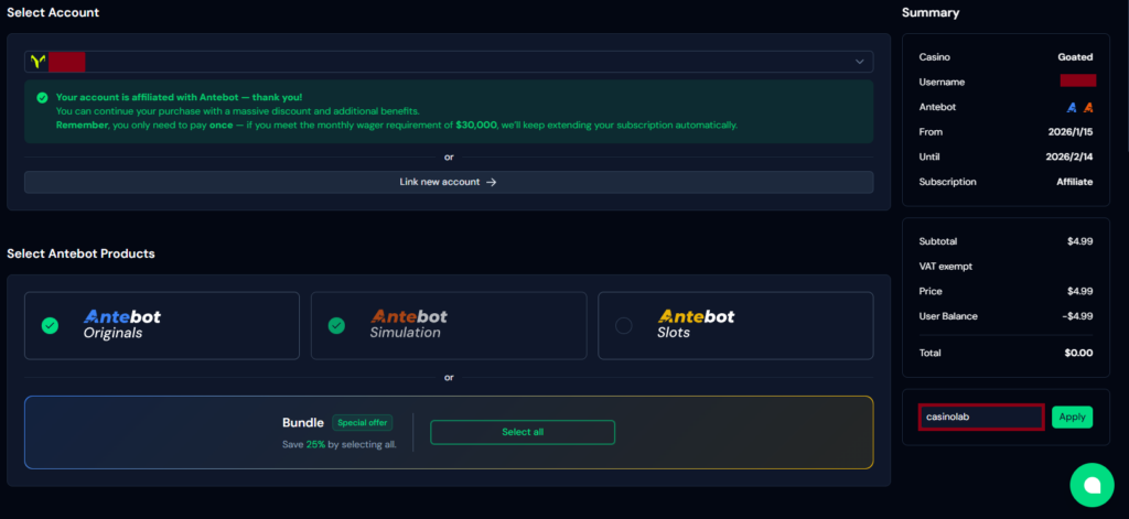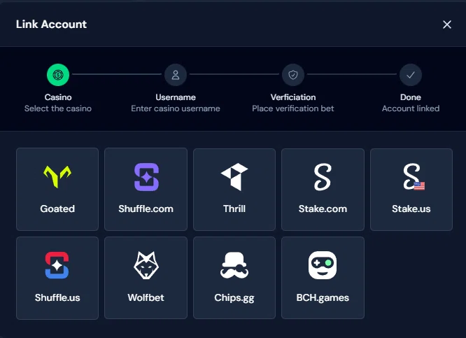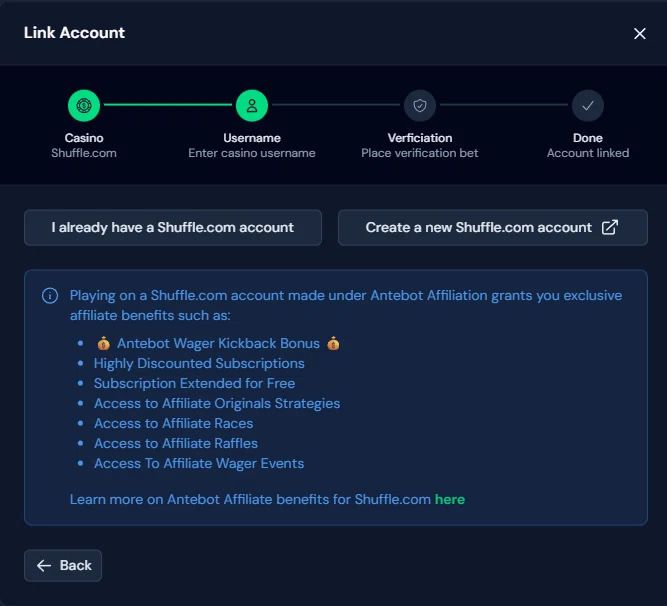 - マルチカジノ対応 – Antebotアカウントに複数のカジノアカウントをリンクでき、一つのアプリでまとめて管理・自動化できます。既存アカウントの登録はもちろん、Antebot経由で新規アカウントを作成すれば追加の提携特典が得られます。