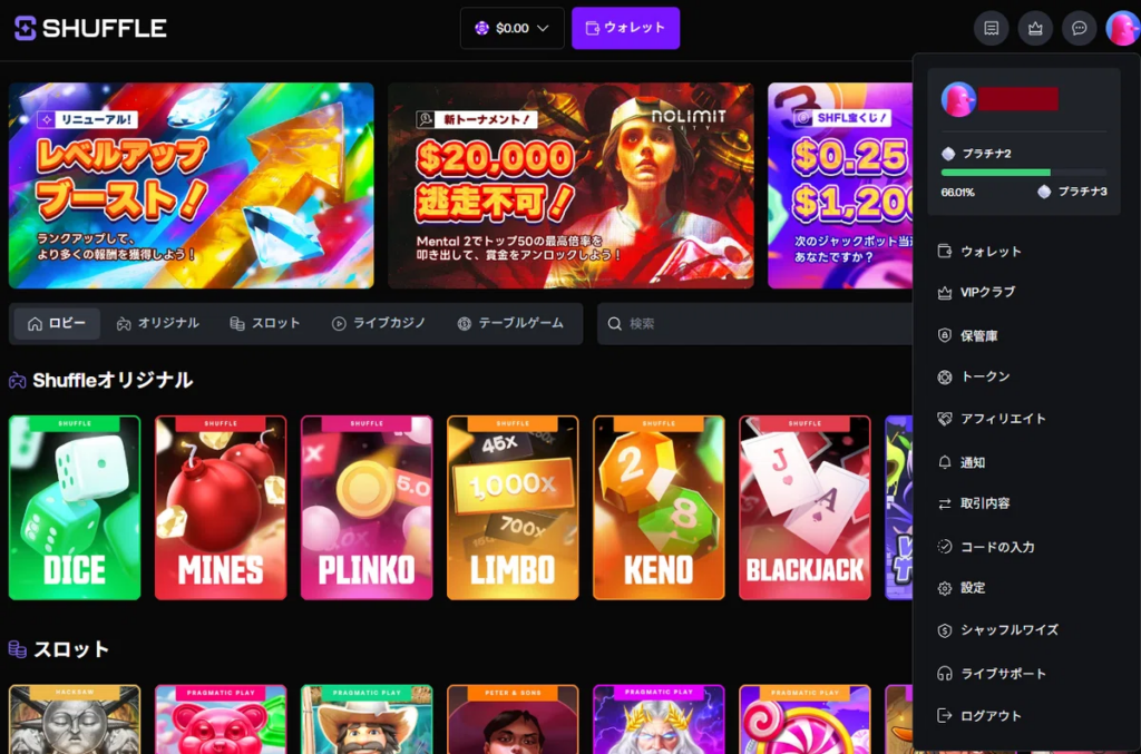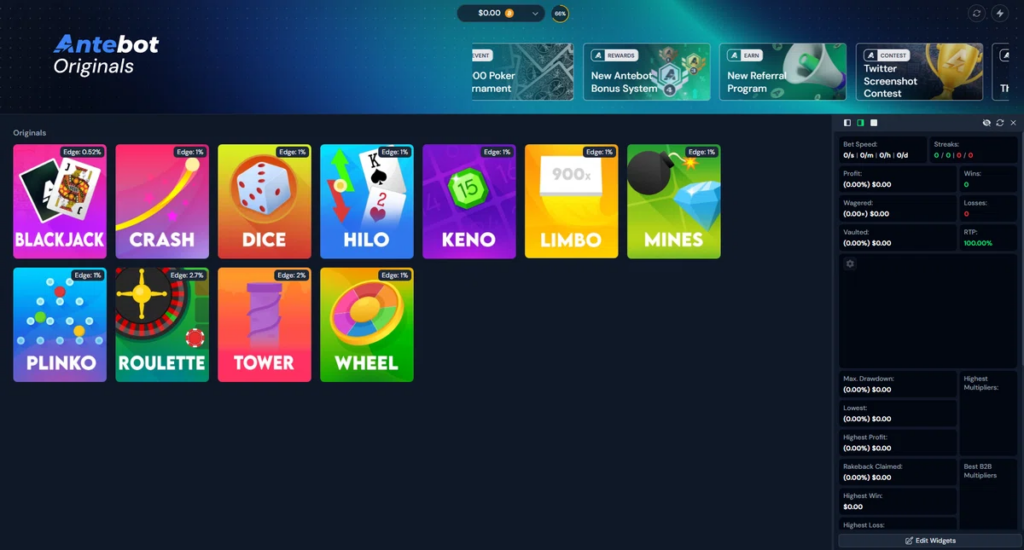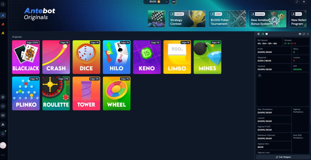 Antebot Originalsは各サイトで提供されているゲーム(ダイスやリンボなど、一通りはあります。)のゲームをプレイできます。