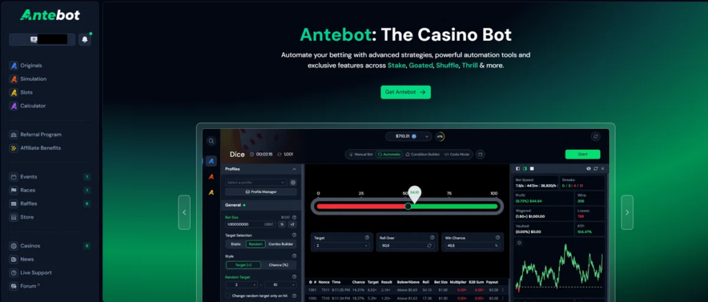 - シミュレーション機能 – 「Antebot Simulation」モードでは実際に賭けをせずに戦略をテストできます。シミュレーションは各カジノのハウスエッジを用いたProvably Fairなアルゴリズムで動作し、無制限の仮想コインでリスクなしに試行が可能です。
