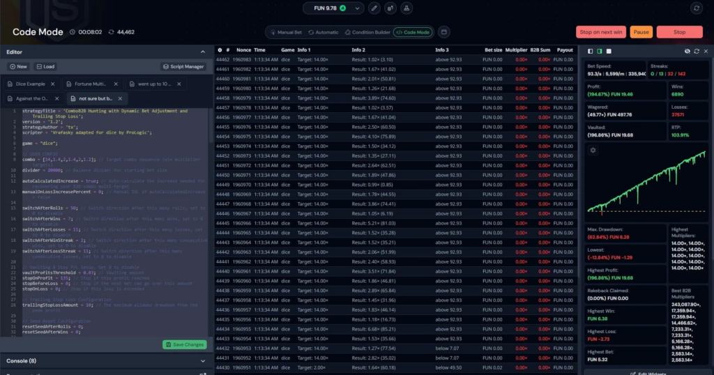 - 高度なベット戦略 – 条件分岐やJavaScriptによるコードモードで、複雑な戦略を組み込めます。例えば「連敗が続いたらベット額をリセットする」などのルールを設定したり、自作スクリプトで自由度の高い戦略を作成できます。